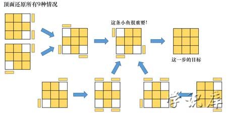 这是三阶魔方的最后一个步骤,把顶层的4个棱块归位。这步一共也是只有三种情况: