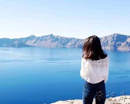 一个女孩,披着短发,略有凌乱,穿着休闲服饰,显示出散漫、自由不拘谨,看这远处风景,在犹豫?在思考?在欣赏?深沉的湖水,高耸的山头,令人无限遐想。