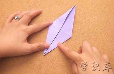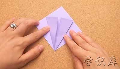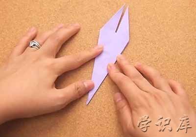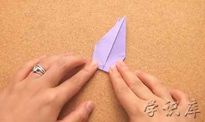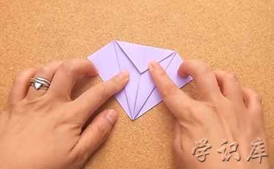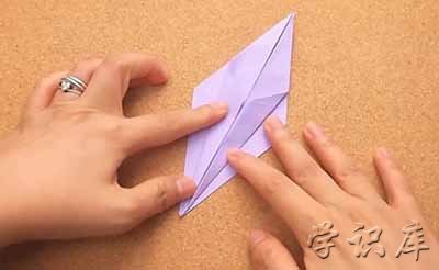 5、把上半片的右下部分拉到中线。折起。左下部分也同样操作。你的折纸从上面来看就像个风筝一样了。