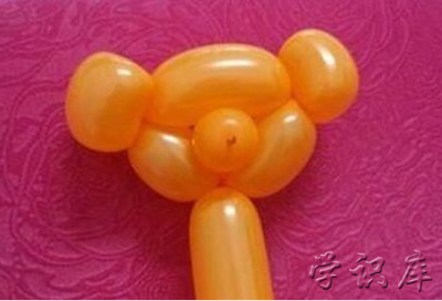 第七步:用手把圈圈上面的小气球往下面按,再把左右的小气球扭几圈做成熊熊的耳朵。